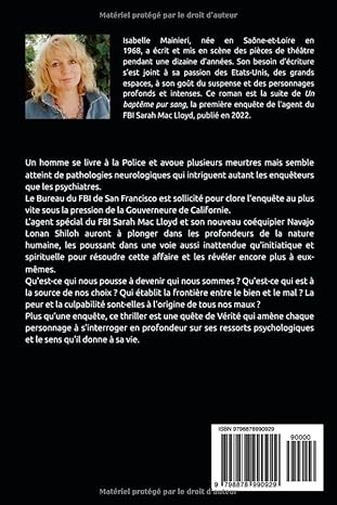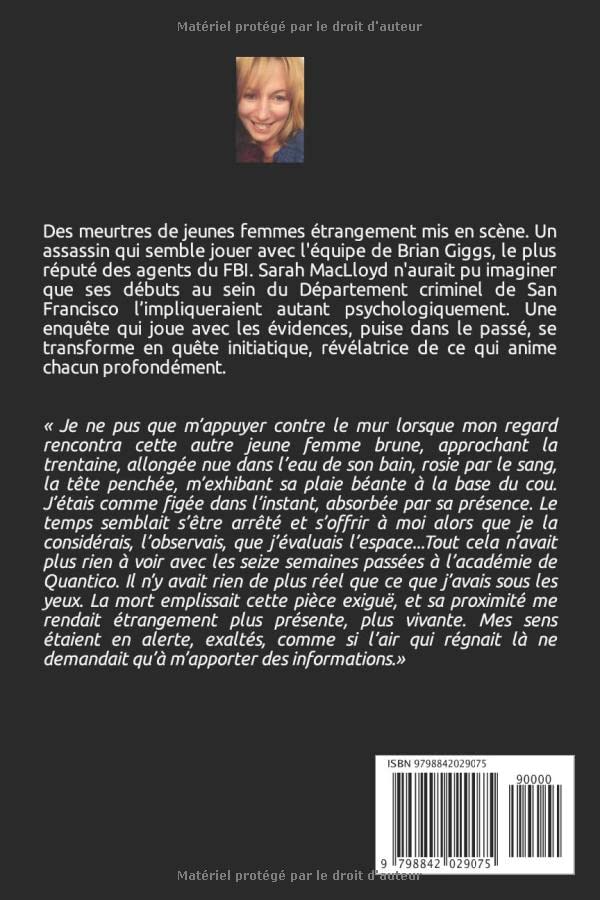 Des meurtres de jeunes femmes étrangement mis en scène. Un assassin qui semble jouer avec l’équipe du plus réputé des agents du FBI. Sarah Mac Lloyd n’aurait pas imaginer que ses débuts au Département criminel de San Francisco l’impliqueraient autant psychologiquement. Une enquête qui joue avec les évidences, puise dans le passé, se transforme en quête initiatique, révélatrice de ce qui anime chacun profondément.